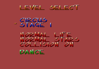 Once on the level select screen (see above), press: Left, Right, A, B, C, Left, Right, Up, Down, Left, Right. This will give you infinite stars, and protect you from collisions (see right). Also, you'll be able to fly by throwing a star and pressing Up at the same time. |