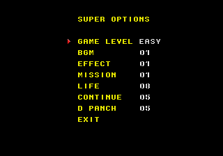 On the title screen press the C button 10 times then press Start. Move the red arrow so that it points to Options then press the C button 10 times again and press start to enter the Options screen. You should now have access to the Super Options screen (see right). |