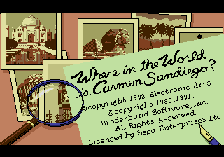 A well-written and immensely popular series of games that first made their appearance on the venerable Commodore 64 and have been kicking around in one form or another ever since. Only the first and third in the the series were ported to the Genesis; it is unclear why the second (Where in the USA...) was not. In Where in the World is Carmen Sandiego?, Carmen and her gang are stealing the world's great art treasures - originally packaged with the 1992 New World Almanac. |