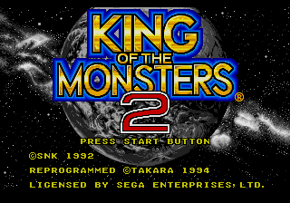 Slant-perspective fighters that remind me of pseudo-3D versions of Rampage, with all the delicious fun that the comparison invites. Now if it weren't for those little JSDF vehicles running interference now and again, you might be able to beat your foe with ease - but hey! You're one of the big boys now! I'll just put my foot over this pesky little tank, and - STOMP! Hey, fighter jock! Try my 15-ton backhand for size! WHACK! Hours and hours of enjoyably mindless mayhem. King of the Monsters 2 is set three after the original release, the three surviving monsters get to deal with six alien monsters at various sites around the world. |